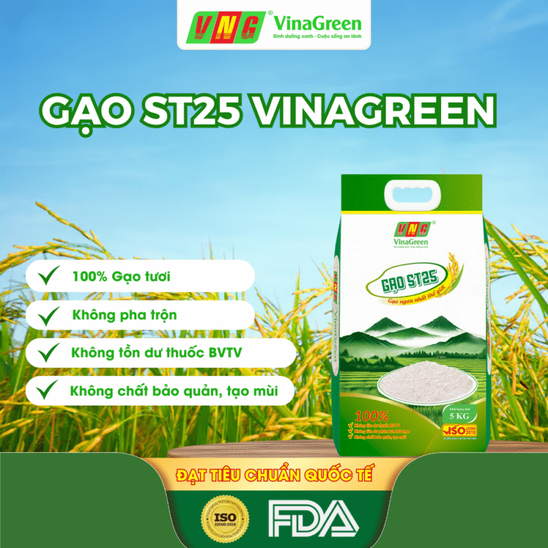 Gạo ST25 Lúa tôm đặc biệt VinaGreen hạt trắng trong, thon dài, thơm mùi lá dứa pha hương cốm non đặc trưng, vị ngọt đậm, dẻo ngon thượng hạng, giàu dinh dưỡng và rất an toàn, đáp ứng mọi yêu cầu cao nhất của người dùng trong nước và xuất khẩu.