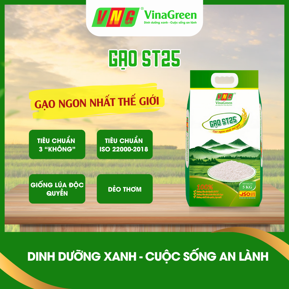Gạo ST25 VinaGreen – gạo ST25 ngon chính hãng, hạt dài, dẻo, thơm tự nhiên. Sản xuất theo công nghệ sạch, đạt chuẩn ISO 22000:2018 đáp ứng tiêu chuẩn Xuất Khẩu. Giao hàng tận nơi toàn quốc.